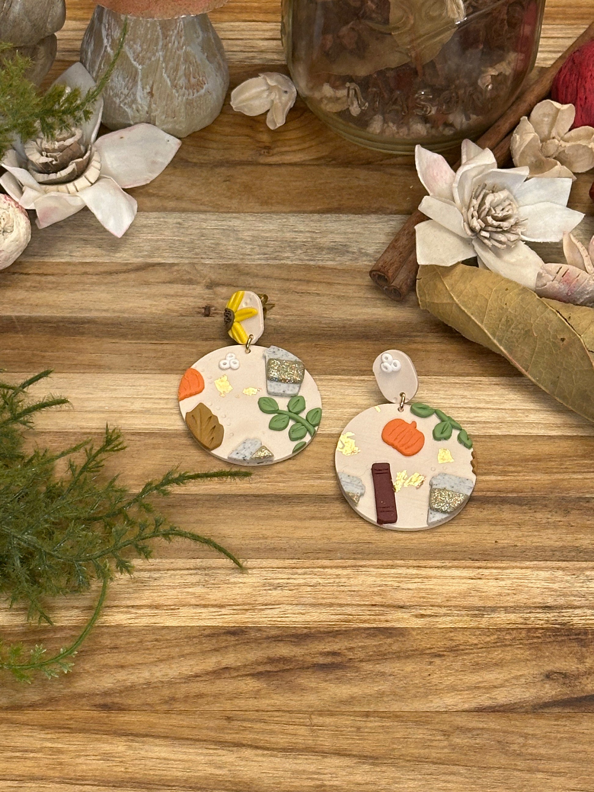 If you are a fall girl like me, these will go with any outfit. A cute and quirky slab with sunflowers, fall leaves, coffee cups, pumpkins and eucalyptus leaves. Each pair will differ slightly due to the nature of this creation. They have hypoallergenic gold posts.