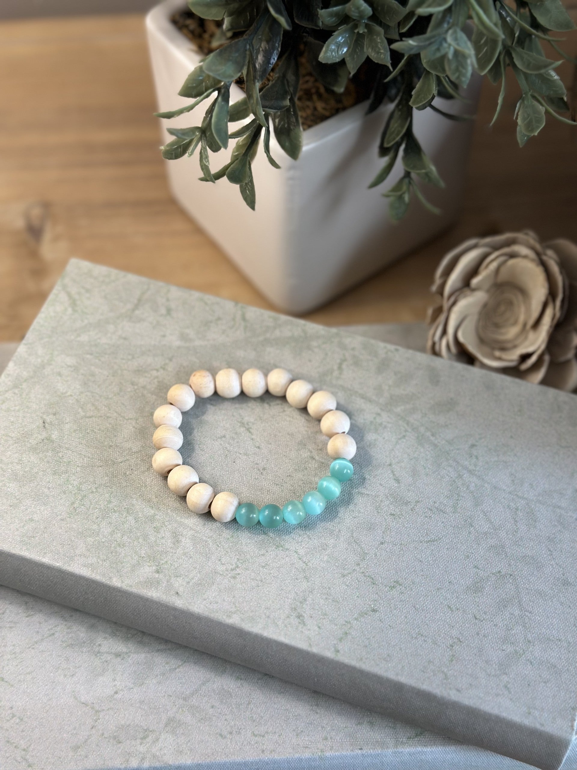 The Ocean Breeze bracelet features a harmonious blend of natural cream-colored wooden beads and a refreshing teal-hued glass beads, reminiscent of a tranquil beach day. This piece is perfect for adding simplicity and serenity.