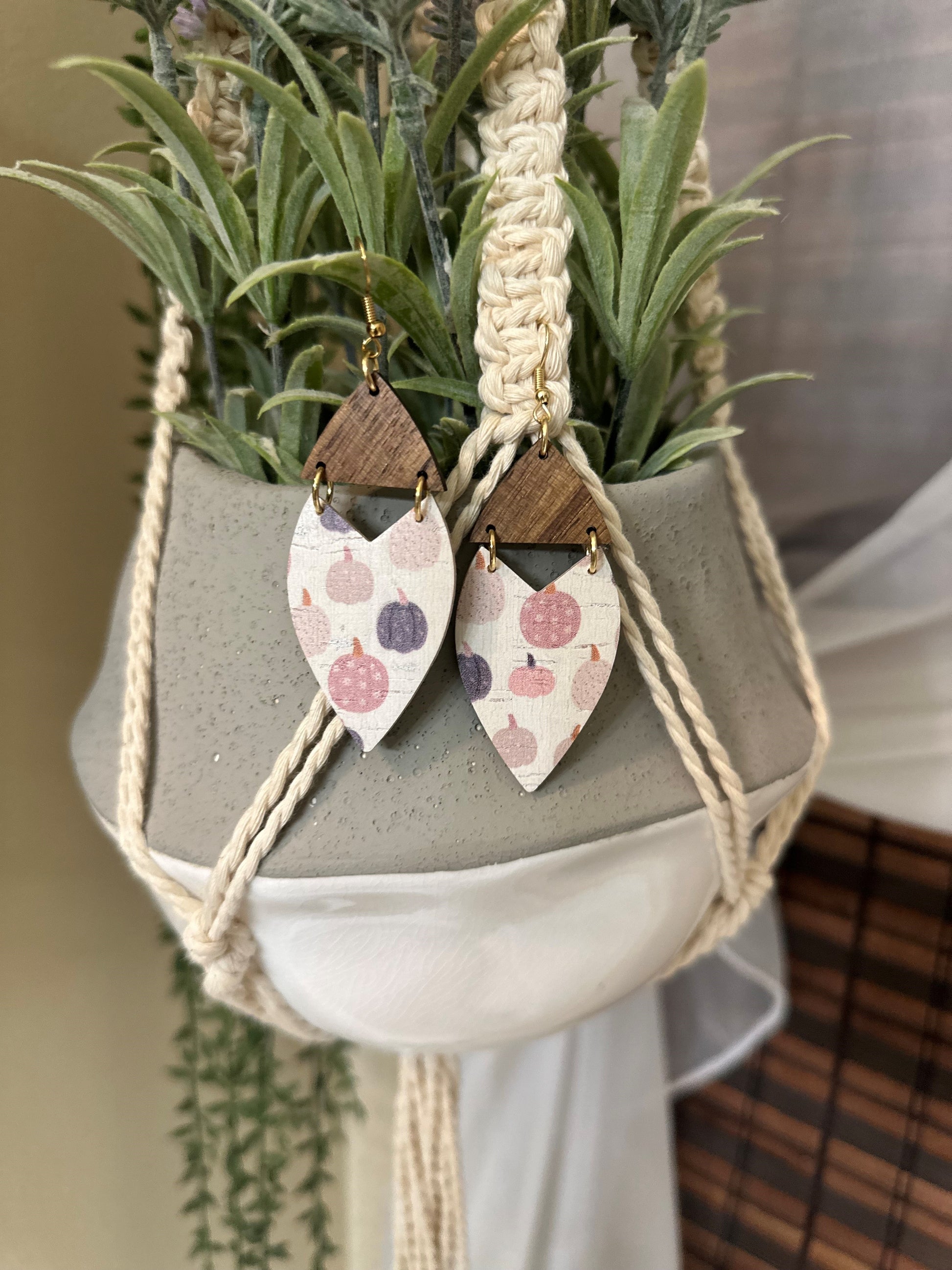 These stylish, handcrafted earrings feature a a combination of wood with teardrop leather in pink and purple fall pumpkin inspired print. Creating a lightweight, boho-chic accessory perfect for any outfit.