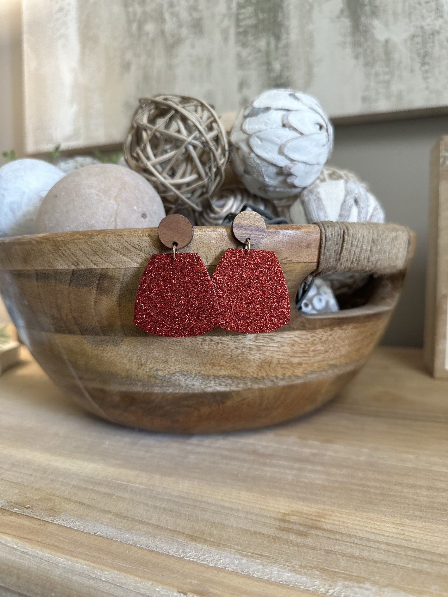 These leather earrings are fun and festive! Featuring a Santa red glitter tear drop with a beautifully warm wooden stud. Perfect for any Christmas outfit this year.